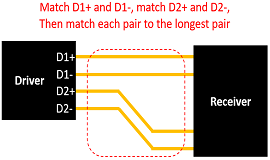 上面顯示的差分對(duì)在單個(gè)驅(qū)動(dòng)器(例如,FPGA)和兩個(gè)不同的接收器之間路由。每個(gè)接收器分別讀取D1和D2上的差分信號(hào)。在此,差分對(duì)D1的每一端都需要進(jìn)行長(zhǎng)度匹配。類似地,差分對(duì)D2的每一端都需要長(zhǎng)度匹配。但是, D1和D2不需要彼此匹配,因?yàn)樗鼈儧]有并行傳輸數(shù)據(jù)。這些差分對(duì)中的每對(duì)一次只傳送一個(gè)比特,我們只需要進(jìn)行長(zhǎng)度匹配以確保在每對(duì)中消除共模噪聲。