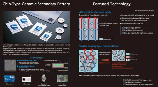 EnerCera有兩種類型:“ EnerCera Coin”,一種厚度為1毫米至2毫米的硬幣型電池,用于安裝在電路板上;“ EnerCera Pouch”,一種超薄且可彎曲的電池,厚度為0.4毫米至0.45毫米,用于嵌入卡。EnerCera硬幣是通過向其帶有電極和隔板的全陶瓷堆疊式整體中添加少量液體電解質制成的。NGK將這些獨特的電池定義為“半固態(tài)電池”。他們取得了世界上第一個工作溫度為85°C的鋰離子二次電池,使用壽命長達10年,這是對物聯(lián)網設備的兩個很大要求。