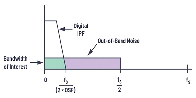 在理想的Nyquist ADC中,ADC的LSB大小將確定在進行模數(shù)轉(zhuǎn)換時添加到輸入的量化噪聲。該量化噪聲分布在fS / 2的帶寬上。為了對抗量化噪聲,第一種技術(shù)是過采樣,即以比奈奎斯特頻率高得多的速率采樣輸入信號,以提高信噪比(SNR)和分辨率(ENOB)。在過采樣中,采樣頻率選擇為Nyquist頻率(2×fIN)的N倍,結(jié)果,現(xiàn)在相同的量化噪聲必須在N倍Nyquist頻率上擴展。這也放寬了對抗混疊濾波器的要求。過采樣率(OSR)定義為fS / 2fIN,其中fIN是感興趣的信號BW。作為一般準則,對ADC進行四倍的過采樣可提供額外的分辨率,或動態(tài)范圍增加6 dB。增加過采樣率將導致整體噪聲降低,并且由于過采樣而導致的動態(tài)范圍(DR)改善為ΔDR= 10log10 OSR,以dB為單位。