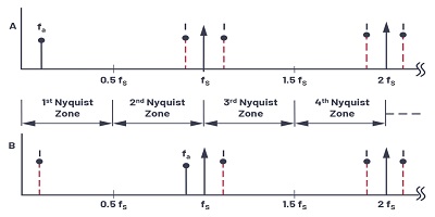 奈奎斯特帶寬定義為從直流到fS / 2的頻譜。頻譜被劃分為無數(shù)個奈奎斯特區(qū),每個區(qū)的寬度等于0.5fS。實際上,理想的采樣器由ADC和FFT處理器代替。FFT處理器僅提供從直流到fS / 2的輸出;也就是說,出現(xiàn)在第一個奈奎斯特區(qū)域中的信號或別名。