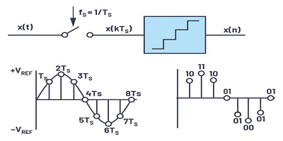 數(shù)據(jù)的數(shù)字化涉及采樣和量化的兩個基本過程,如圖1所示。采樣是第一步,其中使用采樣將連續(xù)時間變化的模擬信號x(t)轉(zhuǎn)換為離散時間信號x(n)。頻率fS。結(jié)果平均間隔為1 / TS(fS = 1 / TS)。
