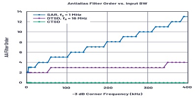 如果選擇400 kSPS的采樣速度來放寬濾波器的階數(shù),則對于> 300 kHz的輸入頻率,則需要抑制。增加采樣速度將增加功率,對于雙倍速度,功率也將增加一倍。由于采樣頻率遠高于輸入帶寬,因此,以功率為代價的進一步過采樣將進一步放寬抗混疊濾波器的要求。