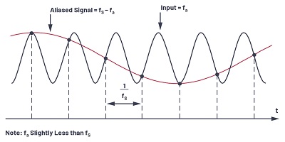 現(xiàn)在考慮信號在圖3中第一個Nyquist區(qū)域之外的情況。信號頻率僅略小于采樣頻率,這與圖2時域表示中所示的條件相對應。請注意,即使信號在第一個奈奎斯特區(qū)域之外,其圖像(或別名)fS – fa落在內(nèi)部。返回圖3,很明顯,如果一個不想要的信號出現(xiàn)在fa的任何鏡像頻率上,它也會出現(xiàn)在fa上,從而在第一奈奎斯特區(qū)中產(chǎn)生一個雜散頻率分量。