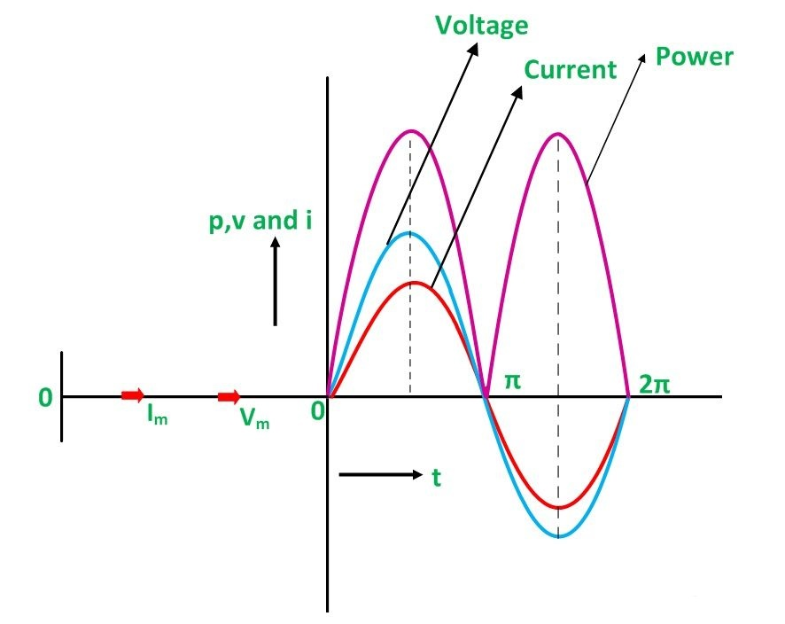 此外,如果我們檢查同一電路的圖形表示,從其功率曲線可以看出,任何時(shí)候功率周期的任何部分都不會(huì)變?yōu)樨?fù)。因此,在純電阻電路中,功率永遠(yuǎn)不會(huì)為零。此外,這是由于電流和電壓的瞬時(shí)值始終為負(fù)或正。同樣,純電阻電路的功率循環(huán)頻率是電流和電壓波頻率的兩倍。