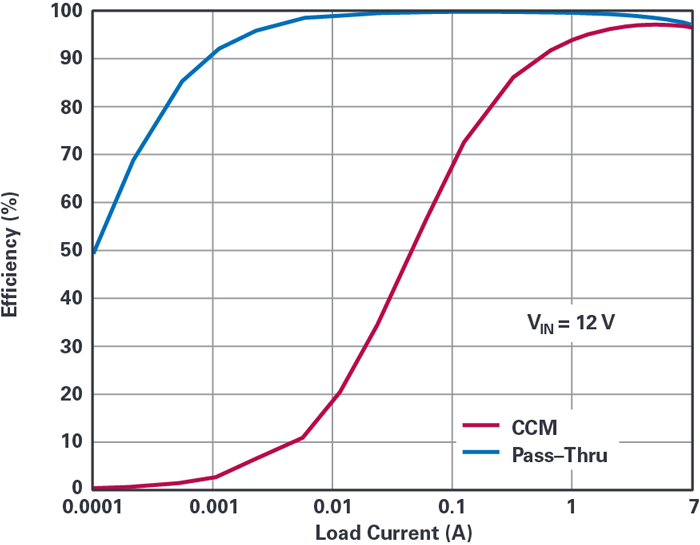 當(dāng)輸入電壓在Pass-Thru窗口內(nèi)時,頂部開關(guān)AD連續(xù)導(dǎo)通,從而允許輸出跟蹤輸入,并使器件進(jìn)入低功耗狀態(tài),并在V INV IN上施加典型的靜態(tài)電流。V INP引腳分別為4 μA18 μA。在這種非開關(guān)狀態(tài)下,既沒有EMI也沒有開關(guān)損耗,使效率可達(dá)到99.9%以上(圖5。