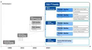 使用Arm Cortex-M3或帶浮點(diǎn)單元(FPU)的Cortex-M4,在40nm處具有TXZxA +(“高端”為A)。采用Arm Cortex-M0,Cortex-M3或Cortex-M4內(nèi)核,SONOS存儲器而非閃存的130nm CMOS中的TXZxE +(E表示“輸入”)。