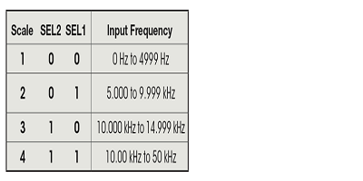 為了實(shí)現(xiàn)轉(zhuǎn)換,將輸入頻率分為四個(gè)刻度,這些刻度由輸入SEL1和SEL2 (圖2)手動(dòng)選擇。