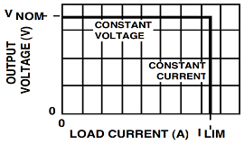 一旦電力系統(tǒng)中的組件進(jìn)入飽和狀態(tài)(即,一旦負(fù)載電阻太低),為了安全起見,系統(tǒng)將需要進(jìn)入恒定電流模式,并且系統(tǒng)應(yīng)具有限流輸出。下面顯示了針對(duì)這種情況的理想系統(tǒng)負(fù)載線。實(shí)際負(fù)載線在低負(fù)載電阻下會(huì)有一些下降,并且系統(tǒng)應(yīng)突然進(jìn)入電流限制狀態(tài)。