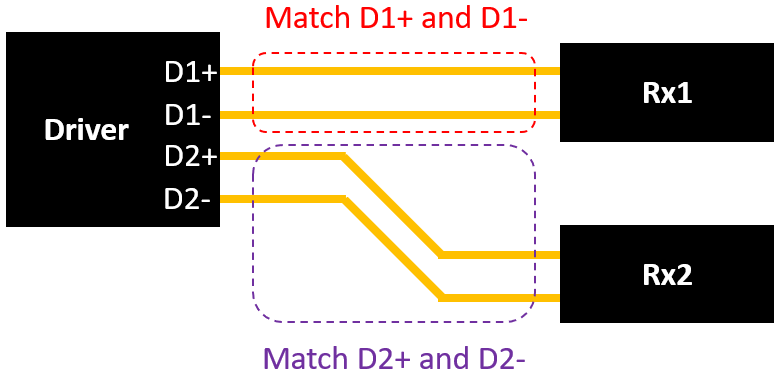 上面顯示的差分對(duì)在單個(gè)驅(qū)動(dòng)器(例如,FPGA)和兩個(gè)不同的接收器之間路由。每個(gè)接收器分別讀取D1和D2上的差分信號(hào)。在此,差分對(duì)D1的每一端都需要進(jìn)行長(zhǎng)度匹配。類似地,差分對(duì)D2的每一端都需要長(zhǎng)度匹配。但是, D1和D2不需要彼此匹配,因?yàn)樗鼈儧]有并行傳輸數(shù)據(jù)。這些差分對(duì)中的每對(duì)一次只傳送一個(gè)比特,我們只需要進(jìn)行長(zhǎng)度匹配以確保在每對(duì)中消除共模噪聲。