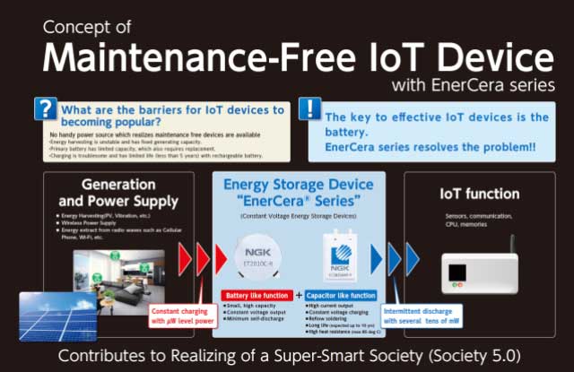 在去年的CES 2019上,NGK Insulators Ltd.(NGK)的硬幣和郵袋類型“ EnerCera”系列榮獲CES創(chuàng)新獎(在智能能源類別中)。隨著二次電池產品系列的推出,解決物聯(lián)網設備電池問題的期望越來越大。晶體取向陶瓷板僅由活性材料組成,在小而薄的主體內實現(xiàn)了高能量密度和低內阻。它還具有高溫安裝的獨特特性。EnerCera系列可以運行需要大電流(例如,幾10 mA至幾100 mA)的IC,傳感器和無線通信系統(tǒng)。此外,CV(恒定電壓)充電功能消除了使用充電器IC控制充電電流的需要。EnerCera系列的定位是在不久的將來提供一次電池的替代產品。