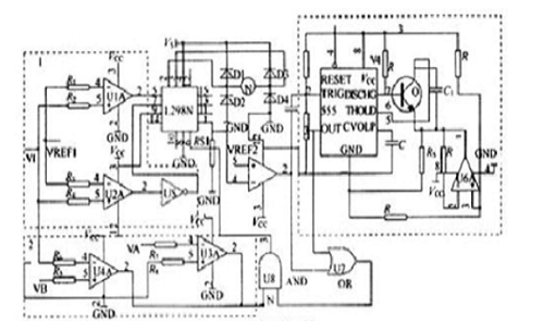 (2)在虛線2的框圖中,兩個(gè)比較器U3A和U4A形成雙極限比較器。當(dāng)VB<vi<va, the="" output="" is="" low.="" when="" vi=""> <vb, the="" output="" is="" high.="" va,="" vb="" upper="" and="" lower="" limits="" of="" <="" span="">爐壓力傳感器轉(zhuǎn)換的電壓,即反應(yīng)堆主體的壓力控制范圍。根據(jù)過(guò)程要求,我們可以指定值只要爐子的壓力在VA和VB之間,就可以達(dá)到VA和VB的水平。電機(jī)停止(注意VB<vrbf1<va, if="" it="" is="" not="" within="" this="" range,="" <="" span="">系統(tǒng)不穩(wěn)定)。