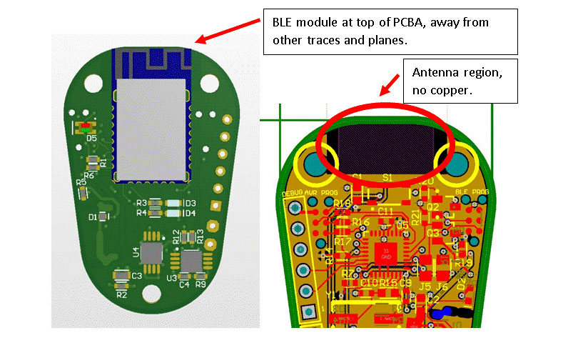 3.在藍(lán)牙芯片組或模塊中進(jìn)行電路設(shè)計時,請使天線區(qū)域完全遠(yuǎn)離附近的銅信號或承載大量能量的組件(尤其是經(jīng)過升壓或降壓轉(zhuǎn)換器切換的電源路徑)。