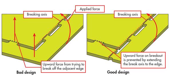 三孔圖案分接板用于板邊緣,其空間和間隙會(huì)阻止使用五孔分接板。分離式面板的設(shè)計(jì)必須使一次斷開(kāi)的所有凸舌共線。陳述的另一種方式是,斷裂軸必須與任何一個(gè)斷裂中涉及的凸耳孔共線。如果在斷開(kāi)操作過(guò)程中突舌的穿孔不是共線的,則某些突舌會(huì)承受垂直于板表面的力,從而在表面層壓板上造成撕裂作用(圖9)。