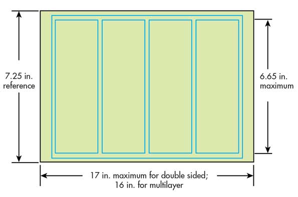 對(duì)于厚度大于或等于0.06英寸(1.5毫米)的FR4或HTFR4 PCB,并排最多可容納1.5英寸的五個(gè)板。板寬,四塊板最大為2.5英寸。板寬,三塊板,最大4英寸。板寬,兩個(gè)用于7.5英寸以下的板。板寬。最長(zhǎng)6.65英寸的板可在面板上旋轉(zhuǎn)90°,并沿著陣列的長(zhǎng)軸并排放置,以適合標(biāo)準(zhǔn)的7.25英寸。寬度。僅當(dāng)結(jié)果面板的長(zhǎng)度大于寬度時(shí),這才有意義,因此您可以將板子添加到陣列中以有效利用制造商的面板(圖13)。