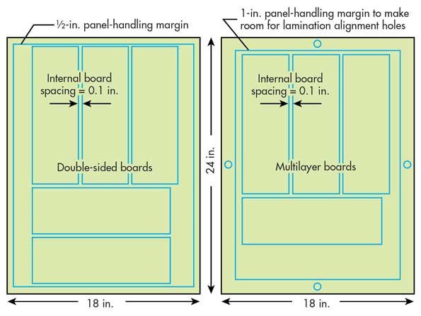 您應(yīng)該設(shè)計(jì)PCB陣列,以確保在整個(gè)過(guò)程中運(yùn)行多個(gè)電路板的好處,同時(shí)從PCB制造商的標(biāo)準(zhǔn)處理面板中獲得上限數(shù)量的電路板。為了便于將來(lái)的PCB突破而對(duì)陣列進(jìn)行的每一次切割都會(huì)在一定程度上削弱面板的性能。因此,還必須限制陣列的尺寸,以防止PCB陣列變?nèi)?,這可能會(huì)導(dǎo)致在放置和放置機(jī)器中產(chǎn)生振動(dòng)并在波峰焊接機(jī)中引起下垂。典型的PCB制造商使用自己選擇的標(biāo)準(zhǔn)面板尺寸,通常為18×24英寸。他們需要1/2英寸的尺寸。處理雙面面板和1英寸面板時(shí)的周界間隙。處理多層PCB時(shí)的間隙。在18-×24-in。面板,這意味著雙面和16-×22英寸的可用面板空間為17×23英寸。英寸的多層板空間。他們將在板陣列之間需要約0.1英寸的布線空間,因此這也是無(wú)法使用的面板空間??梢允褂迷S多“面板計(jì)算器”來(lái)幫助您從制造商的標(biāo)準(zhǔn)面板上獲得上限的板數(shù)。但是,如果您沒(méi)有獲得70%的使用率,則應(yīng)該更加努力(圖1)。