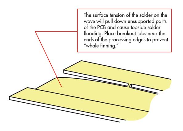 8.波峰上焊料的表面張力會(huì)拉低PCB上不受支撐的部分,并導(dǎo)致頂部焊料溢流。在處理邊緣的末端附近放置分接凸耳,以防止“鯨魚劃傷”。