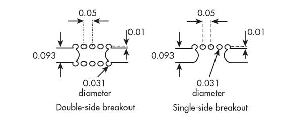 五孔穿孔圖案是可分離凸耳的標(biāo)準(zhǔn)配置。在限制走線或組件邊緣間隙以及必須將凸片放置在懸垂零件下方的情況下,可以使用用于孔口的三孔圖案。三孔突圍要弱得多,與五孔突圍的間距必須更近。