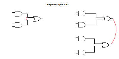 當(dāng)邏輯門的兩條未連接的信號線之間發(fā)生短路時,就會發(fā)生橋接故障。盡管未連接的線之間的柵極間短路似乎不祥,但組合電路中的橋接故障會引起邏輯振蕩。反饋橋接故障會將具有僅依賴于其輸入狀態(tài)的輸出的組合電路轉(zhuǎn)換成具有依賴于輸入時序的輸出的順序電路。更糟的是,同一電路中可能會發(fā)生單橋接故障和多橋接故障。與僅影響兩條線路的單個橋接故障相反,多重橋接故障可以模仿具有公共線路的許多單一橋接故障。