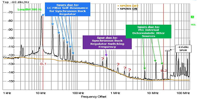 請注意,上圖中的強(qiáng)烈毛刺是由多種原因引起的??梢詫⑸鲜鲈肼暸c電路板上相關(guān)組件的參考規(guī)格進(jìn)行比較。可以通過以-10 dBc / Hz的斜率穿過相位噪聲規(guī)范點(diǎn)來畫一條線來完成。超過此線的噪聲頻譜的任何部分都將落在允許的相位噪聲容限之外,并且需要在設(shè)計(jì)中加以抑制。