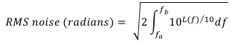 可以使用以下公式根據(jù)RMS相位抖動(dòng)值來量化可接受的相位噪聲電平。請注意,L(f)是對數(shù)相位噪聲數(shù)據(jù),因此10的奇數(shù)因子出現(xiàn)在積分中,以將其轉(zhuǎn)換回線性數(shù)據(jù)集。此處的積分取自相關(guān)信號(hào)范圍。