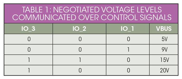 在這種方法中,芯片檢測(cè)并與設(shè)備協(xié)商功率,并通過(guò)控制信號(hào)傳達(dá)協(xié)商的功率水平。協(xié)商的電源可以為5、9、15或20 V (表1)。該芯片還實(shí)現(xiàn)了進(jìn)出電池組的電源路徑。