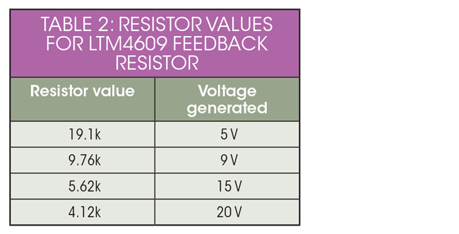 電阻器網(wǎng)絡(luò)的作用是從USB Type-C PD芯片獲取控制信號(hào),并為穩(wěn)壓器的反饋電阻器創(chuàng)建等效電阻。例如,假設(shè)您使用LTM4609降壓-升壓型穩(wěn)壓器作為標(biāo)稱電壓為16 V的電池組中的穩(wěn)壓器。表2列出了電阻網(wǎng)絡(luò)必須為穩(wěn)壓器的反饋電阻生成的電阻值。