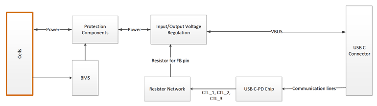 穩(wěn)壓器: 此芯片為USB Type-C VBUS提供所需的電壓,該電壓已由USB Type-C PD芯片協(xié)商確定。電壓可以為5、9、15或20V。根據(jù)電池組的標(biāo)稱電壓,調(diào)節(jié)器的拓?fù)淇梢允墙祲?,升壓或降?/span>-升壓。需要選擇與芯片一起使用的功率組件,以處理高達(dá)100 W的功率。某些穩(wěn)壓器將通過(guò)I 2與USB Type-C芯片接口C并提供所需的電壓。其他設(shè)置方式需要提供USB Type-C芯片所需的電源。在需要通過(guò)USB Type-C PD為電池組充電的應(yīng)用中,芯片必須能夠允許雙向電流,并且能夠以恒定電流/恒定電壓(CC / CV)算法調(diào)節(jié)功率以進(jìn)行充電鋰離子電池。