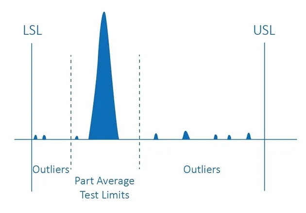 PAT使用統(tǒng)計(jì)技術(shù)來確定這些測試結(jié)果的限制。設(shè)置這些測試極限是為了刪除輪廓線(其參數(shù)與典型零件在統(tǒng)計(jì)上不同的零件),并且對通過良好控制的過程正確加工的零件的成品率影響應(yīng)最小。