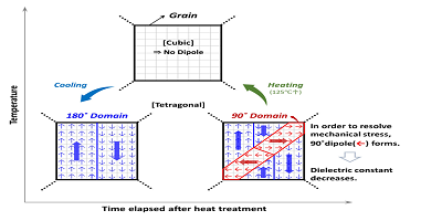 5.當(dāng)溫度降到居里點(diǎn)以下時(shí),MLCC會(huì)發(fā)生老化。偶極子切換到90°域以減輕內(nèi)部機(jī)械應(yīng)力。