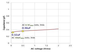 現(xiàn)在,如果在標(biāo)準(zhǔn)測(cè)量條件下將交流電水平從500 mV RMS降低至10 mV RMS, 同時(shí)保持相同的1kHz頻率和3V dc偏置,則有效電容將進(jìn)一步降至0.32 μF,額外降低4%減少。但是,增加交流信號(hào)幅度會(huì)增加有效電容(圖2),即使只是微不足道。但是請(qǐng)注意,這并非普遍正確。
