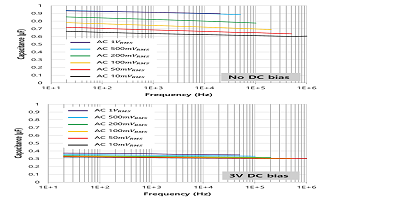 4.不同的頻率水平也會(huì)影響有效電容,這取決于:無(wú)直流偏置(上);施加3V直流偏置(底部)。