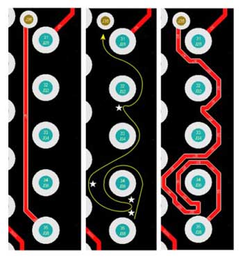 組件的放置和布線是PCB設計工具提供的原始功能,而這些功能對于當今的設計師仍然至關重要。當今先進的設計工具通過交互式布線來沿光標路徑放置布線部分,實現(xiàn)在障礙物上推動或行走,并自動跟隨現(xiàn)有連接,從而幫助較大化布線效率和靈活性。光標引導的布線使圍繞障礙物的復雜手動布線變得快速,輕松和直觀。用鼠標創(chuàng)建路徑,交互式布線器會嘗試根據該路徑放置軌道。圖1顯示了如何在光標移動引導的情況下快速創(chuàng)建復雜的路線。左圖顯示了一條正常的最小長度的路線,中圖顯示了光標路徑,星號表示單擊位置以提交路線的各個部分。正確的圖像是最終的布線。盡管是一個極端的示例,但它顯示了放置多個軌道所需的布線提交數量。