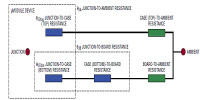 在幾乎每一個嚴格的,精確的溫度控制場景中,對熱狀況進行精確建模都是必不可少的。全面的LTM4663數(shù)據(jù)表在其許多性能和應用細節(jié)中,從圖形上表示了許多內(nèi)部和外部熱阻(圖3;藍色電阻包含在μ Module穩(wěn)壓器中,而綠色電阻是外部電阻)