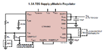 1. ADI公司的LTM4663是一款采用小型封裝的完整1.5A吸入,源熱電冷卻器(TEC)穩(wěn)壓器。在支持熱敏電阻和RTD溫度傳感器的同時,它可以提供和吸收高達1.5 A的電流