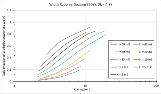 這個圖可能看起來很復雜,但它有一個簡單的解釋。每條曲線在 y 軸上與 1 相交的間距值將導致差分對中的走線寬度等于走線不是差分對的一部分時的走線寬度,同時仍提供相同的阻抗。換句話說,隔離的走線和成對的走線在每個電介質厚度的特定間距值下將具有相同的寬度和50歐姆阻抗。