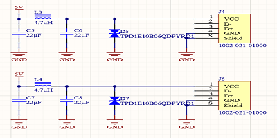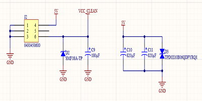除了電源濾波之外,我還為每個輸入添加了一些基本的ESD保護。如果像許多貿(mào)易展覽會場館一樣跪在地毯上,準備好相機準備插入設(shè)備時會積聚靜電,這很容易導(dǎo)致ESD事件損壞相當昂貴的設(shè)備。通過在輸入端和穩(wěn)壓器板上提供ESD保護,我們應(yīng)該為攝像機提供相當高的保護等級。我在主電源板上使用的5v線路使用的是相同的0402尺寸TVS二極管TI TPD1E10B06QDPYRQ1。這些雖然很小,但具有汽車認證資格,并且可能能夠在中高濕度條件下處理海平面上的ESD事件。