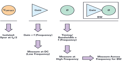 如果僅看增益不匹配,則是低頻或直流不匹配類型。通過在接近dc的低頻下執(zhí)行增益測量,然后在更高的頻率下執(zhí)行增益測量,可以將帶寬不匹配的增益分量與增益不匹配分開。增益不匹配不像帶寬不匹配的增益分量那樣是頻率的函數(shù)。類似的方法用于時序失配。在接近dc的低頻下執(zhí)行測量,然后在更高的頻率下執(zhí)行后續(xù)測量,以將帶寬不匹配的時序分量與時序不匹配分開。