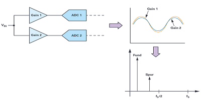 與偏移失配,沒有信號要看到的固有直流兩個ADC的偏移量。對于增益失配,除非存在信號并且可以測量增益失配,否則無法看到增益失配。的增益失配將導(dǎo)致在的有關(guān)的輸出譜的正 的輸入頻率,如良好的采樣率,以及將出現(xiàn)在 ?F 小號 / 2±?F IN。
