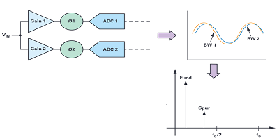 交錯ADC時要注意的一件事是,在輸出頻譜中出現(xiàn)的雜散是由與交錯ADC相關(guān)的缺陷引起的。這些缺陷基本上是兩個交錯的ADC之間的不匹配。四個基本不匹配導(dǎo)致輸出頻譜中的雜散:偏移不匹配,增益不匹配,時序不匹配和帶寬不匹配。