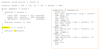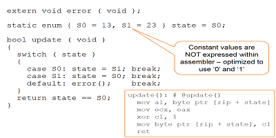 編譯器還決定,由于實(shí)際對象(13和23)的值未在數(shù)字上下文中使用,因此它將僅使用0和1的值在狀態(tài)之間切換,然后使用異或“或”更新狀態(tài)值。二進(jìn)制文件遵循“好像”義務(wù),并且代碼快速緊湊。在其職權(quán)范圍內(nèi),編譯器做得很好。