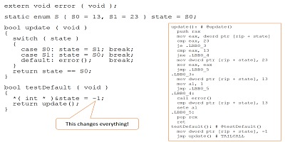僅在初始化“ state”對象時(shí)以及在“ S0”和“ S1”情況下修改“ state”對象,因此編譯器可以推斷出賦予“ state”的唯一值是“ S0”和“ S1”。編譯器得出結(jié)論,不需要“默認(rèn)值”,因?yàn)榧僭O(shè)沒有損壞,“狀態(tài)”將永遠(yuǎn)不包含任何其他值-實(shí)際上,編譯器所做的正是這一假設(shè)。