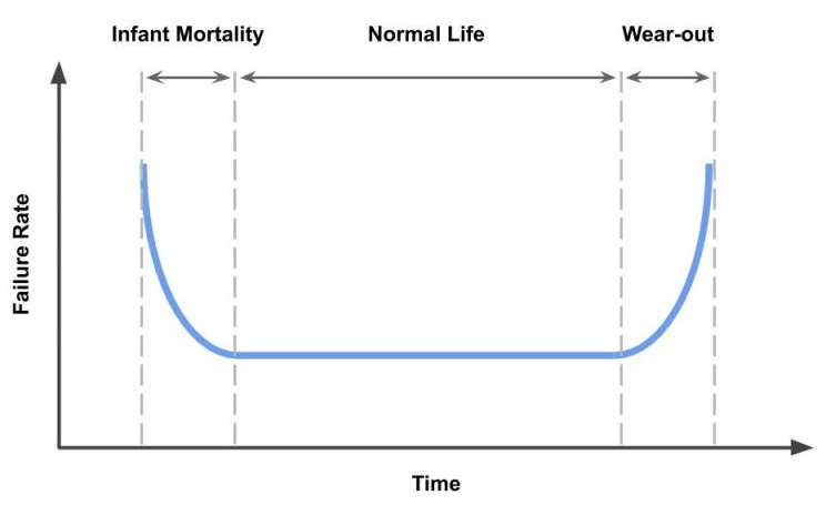 這些可靠性測試的目的是收集足夠的數(shù)據(jù)以形成浴盆曲線(示例如下所示)。不幸的是,“嬰兒死亡率”部分包括由于制造缺陷而導(dǎo)致的早期組件故障。這些測試通常在125°C下進行。