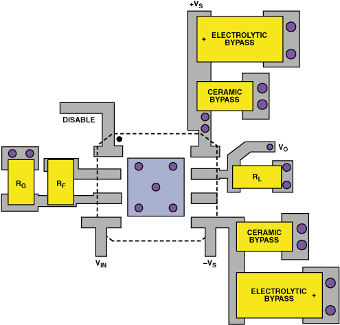 (圖11.AD8045低失真運(yùn)算放大器的印刷電路板布局.)