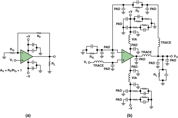 寄生效應(yīng)會(huì)對(duì)你的電路中造成嚴(yán)重破壞。它們是隱藏在高速電路中的雜散電容和電感。它們包括由封裝引線和多余的布線長(zhǎng)度形成的電感器;焊盤(pán)對(duì)地、焊盤(pán)對(duì)電源平面和焊盤(pán)對(duì)跡線電容器;與過(guò)孔的相互作用,以及更多的可能性。圖3(a)是一個(gè)典型的非旋轉(zhuǎn)運(yùn)放的示意圖。然而,如果要考慮寄生元件,同一電路將如圖3(b)所示。