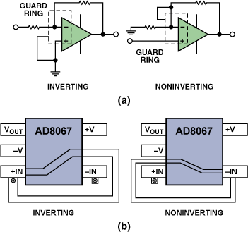 保護(hù)環(huán),或稱(chēng)“保護(hù)”,是與運(yùn)放一起使用的另一種常見(jiàn)的屏蔽類(lèi)型;它用于防止雜散電流進(jìn)入敏感節(jié)點(diǎn)。其原理很簡(jiǎn)單,就是用保護(hù)導(dǎo)體完全包圍敏感節(jié)點(diǎn),保護(hù)導(dǎo)體與敏感節(jié)點(diǎn)保持在或驅(qū)動(dòng)到(低阻抗)相同的電位,從而從敏感節(jié)點(diǎn)吸收雜散電流。圖15(a)顯示了反向和非反向運(yùn)算放大器配置的保護(hù)環(huán)示意圖。圖15(b)顯示了SOT-23-5包的兩個(gè)保護(hù)環(huán)的典型實(shí)現(xiàn)。