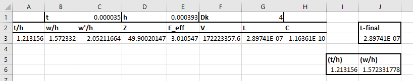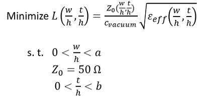 在第一個示例中,我將允許銅的重量和層厚(即,比率(t / h)的值)為優(yōu)化變量?;褰殡姵?shù)為Dk =4。對于上面列出的限制,我選擇了a = 5和b =2。對于我的結(jié)果,我發(fā)現(xiàn)(w / h)= 1.572332 時,最小電感為290 nH /米。(t / h)= 1.213156。