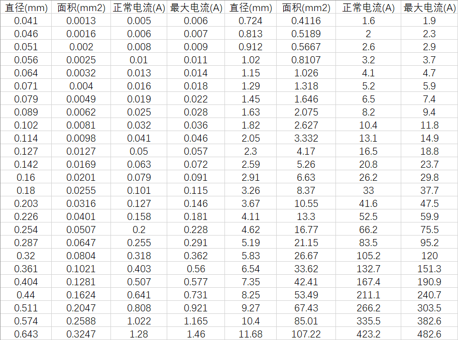 在電路設(shè)計(jì)的過程中,我們需要用到排線、轉(zhuǎn)接線等等;實(shí)際設(shè)計(jì)過程中,導(dǎo)線的線徑不可能無限制的大,因電路設(shè)計(jì)排線、穿線受到結(jié)構(gòu)的限制,且為了節(jié)省成本考慮,電路設(shè)計(jì)中的導(dǎo)線盡可能的細(xì),下面就給出常溫(25℃)下線徑(銅線)與電流的關(guān)系,直接上干貨