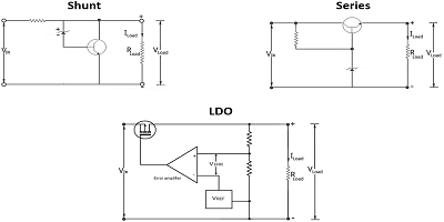 三種常見的線性電壓電路圖:(左)并聯(lián),(中心)系列和(右)LDO