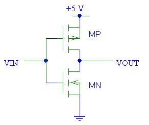 參考上面的CMOS反相器圖,由于CMOS器件輸入端的電壓在5伏和0伏之間變化,因此PMOS和NMOS的狀態(tài)將相應(yīng)地不同。因此,如果將每個晶體管建模為一個由VIN激活的簡單開關(guān),那么毫無疑問,我們可以看到CMOS反相器的功能。