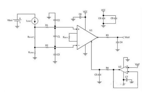 圖5通過(guò)RSHUNT測(cè)量差分電壓,R1、R2、C1、C2和C3用于提供共模和差模濾波,R3和C4為U1 INA提供輸出濾波,U2用于緩沖INA參考引腳. R4和C5用于形成一個(gè)低通濾波器,大限度地減少由運(yùn)算放大器引入到INA參考引腳的噪聲。